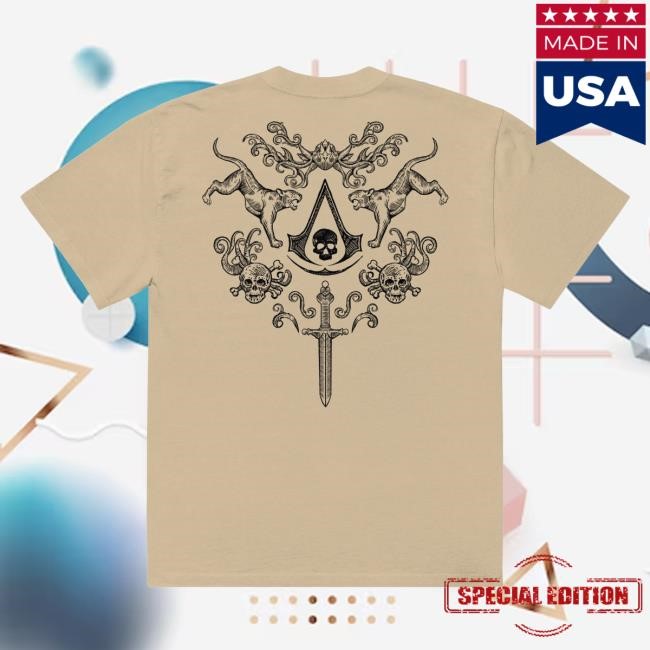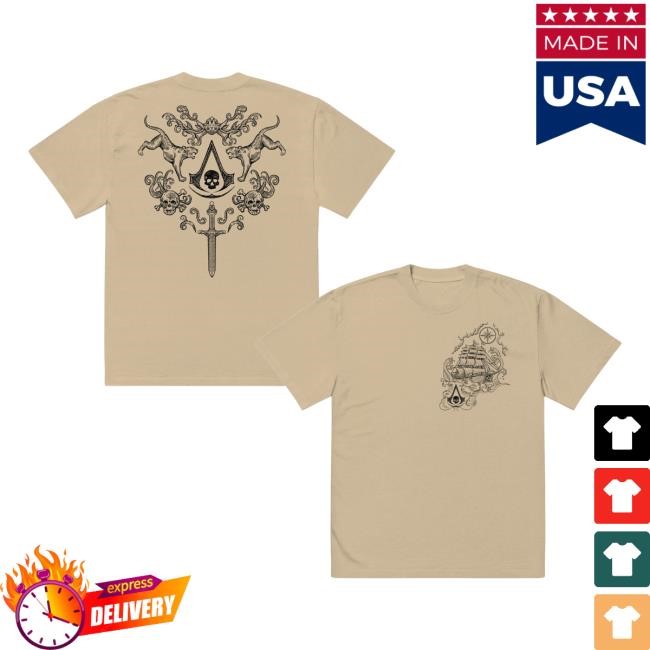 Celebrate the rebellious spirit of the Caribbean Brotherhood with this Assassin’s Creed Black Flag inspired tee. Drawing from the Ubisoft Gear Shop Resynced collection, the design showcases a bold tattoo-style graphic that echoes Edward Kenway’s pirate legacy and the gritty world of high-seas adventure. Blending classic ink aesthetics with iconic Assassin symbolism, this shirt delivers a striking mix of gaming culture and streetwear attitude. Perfect for fans of treasure hunting, naval battles, and the fearless freedom of the Assassin life, it’s a standout piece for everyday wear.